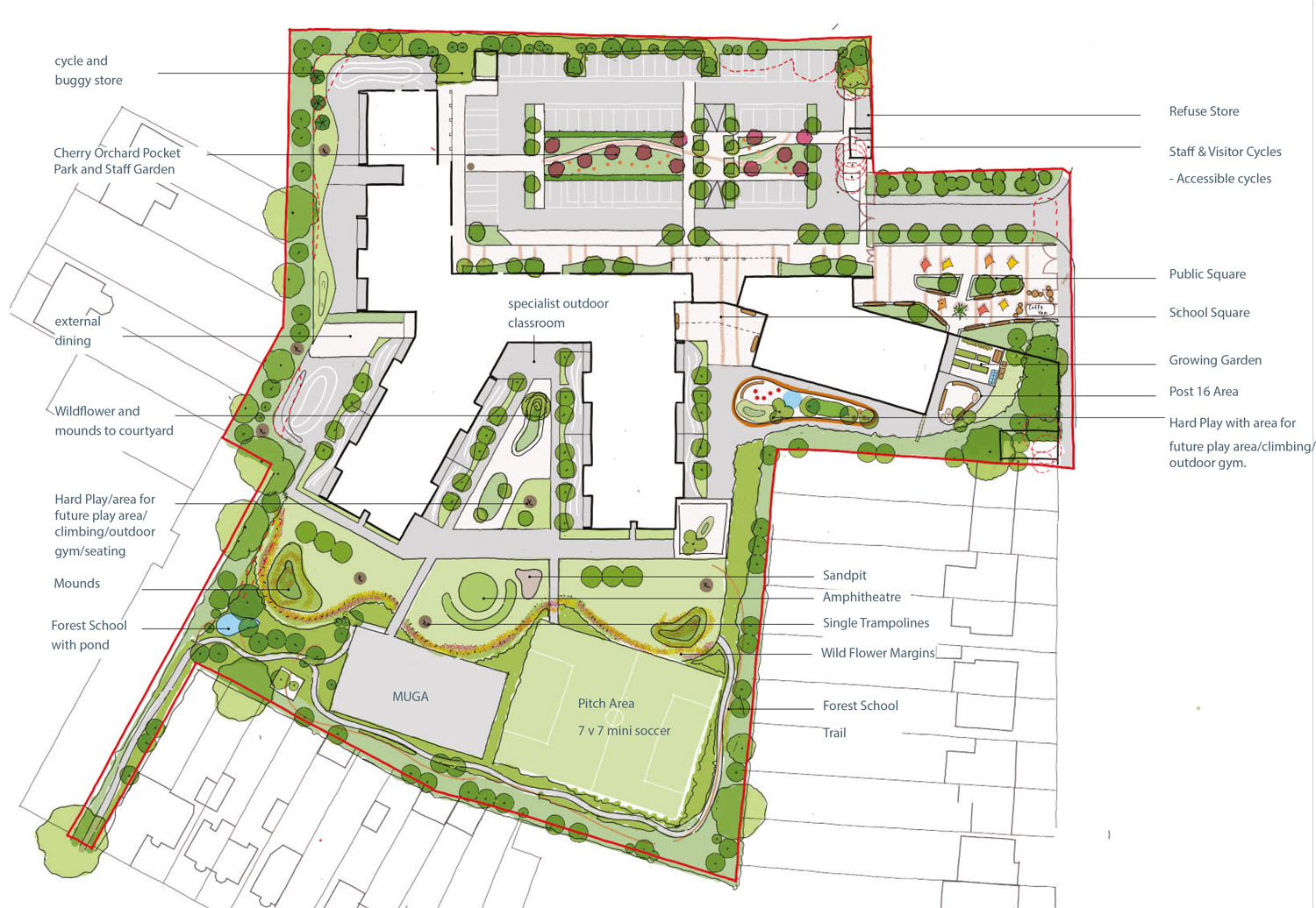 Primary, Secondary and Post Sixteen pupils will all have access to a range of spaces including secure transitional spaces closer to the building and wider areas of soft and hard landscaped spaces providing both passive, social and active play.
